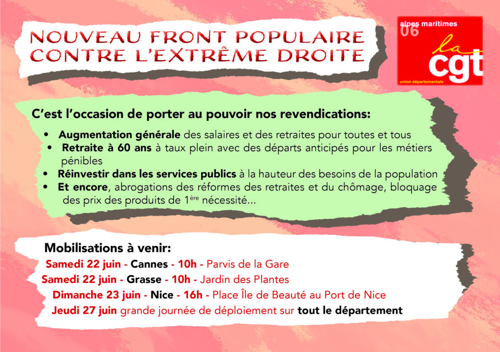 La CGT 06 appelle les salarié·es, retraité·es, privé·es d’emploi et les jeunes à aller voter massivement les 30 juin et 7 juillet pour le programme du Nouveau Front populaire. La CGT mettra tout en oeuvre pour faire barrage à l’Extrême droite.