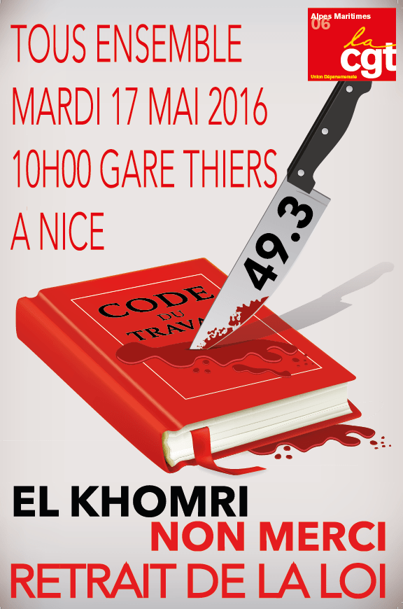 affiche code du travail 17 MAILOI TRAVAIL: Manifestation mardi 17 Mai 2016 10H00 devant la gare Thiers à NICE