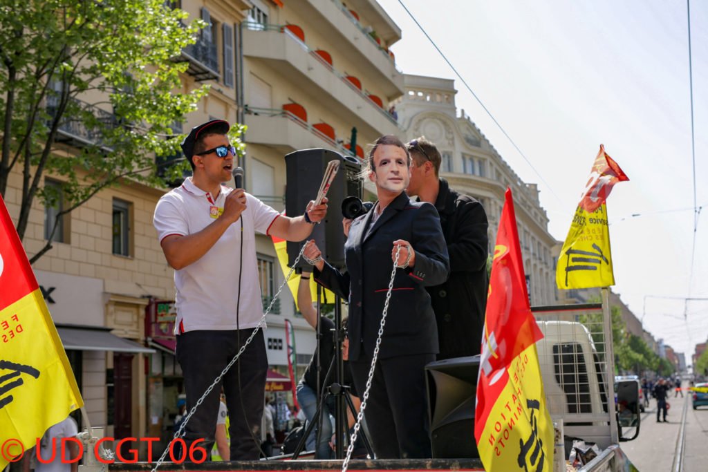 Aujourd’hui, à l’appel de la seule CGT rejoint par des militants de SUD, de la CFDT cheminot et des avocats Niçois du SAF, plus de 5000 personnes ont montré leur détermination à s’opposer aux projets du gouvernement (réforme de la SNCF, de la justice, privatisation des barrages hydroélectriques, casse des services publics, de la poste, des EHPAD, étudiants, transports, Carrefour… Un Macron plus vrai que nature, méprisant les salariés du public comme du privé et en les tenant fermement enchainés qui a ouvert le cortège.