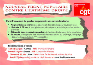 L’Union Départementale CGT 06 a réuni Mercredi 19 Juin 2024 une Assemblée Générale de ses syndicats pour échanger sur la situation inédite dans laquelle se trouve notre pays : En quelques jours, les mobilisations intersyndicales et citoyennes ont fait émerger une autre alternative. La pression populaire a permis de gagner l’unité de la Gauche sur …
