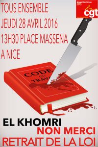 Manifestation samedi 9 avril La mobilisation contre le projet de loi travail dit « El Khomri ». La CGT appelle tous ceux qui sont contre ce projet de loi à un rassemblement Samedi 9 avril 2016 10h30 place Massena en attendant une petite vidéo de la manifestation du 31 Mars